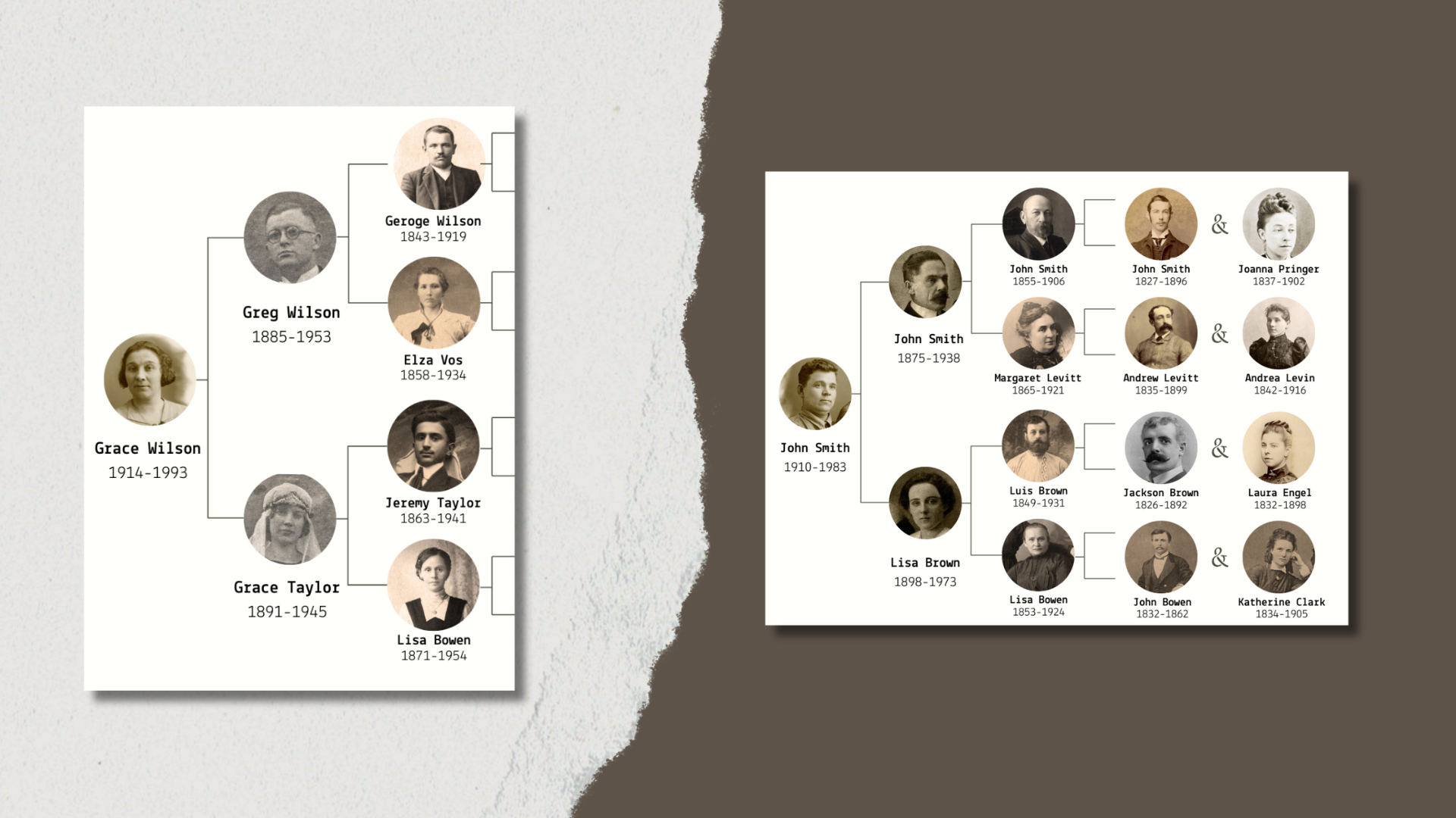 Gyönyörűen megtervezett fa, amely művészi módon örökíti meg családod generációit. A kapcsolatok megjelenítése mellett bemutathatja a családi örökséget és felvillanthatja a történelmi hátteret is.